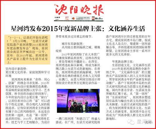 2015年是星河湾品牌的全新升级之年,「文化涵养生活」的主题将从产品层面深入到人文关怀层面,贯穿星河湾全年的产品研发和活动推广。《山西日报》对星河湾2015年的品牌主张的报道开篇直接点题。称生活方式研究院落户后,将成为星河湾思想文化的栖息地,通过文化体验、生活方式等多维角度阐述为居住者带来的生活改变。