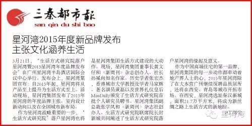 西安《三秦都市报》则报道活动现场为主,介绍星河湾集团董事长黄文仔和《新周刊》杂志创办人、社长孙冕向知名作家、历史学者张宏杰,香港城市大学教授及学者马家辉、著名演员黄磊以及世界礼仪皇后MissDally颁发生活方式研究院首批个人研究员聘书。同时,也讲述星河湾2015年度新品牌发布——文化涵养生活。