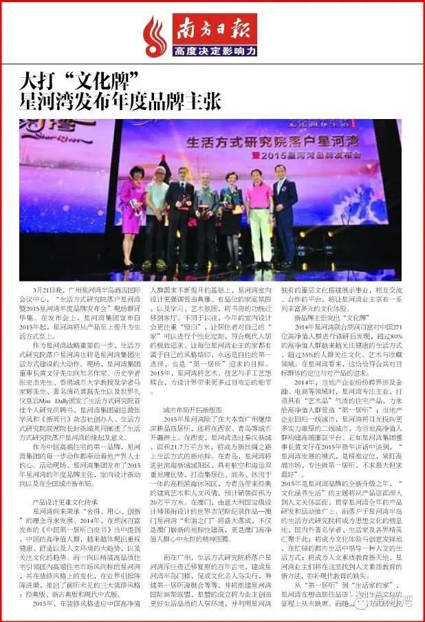 3月37日,《南方日报》从全新视角看2015星河湾品牌发布,揭示2015年星河湾品牌重要理念,向社会传达富有深刻文化内涵的星河湾。从‘第一居所’到‘生活家的家’,星河湾在塑造居住品质与输出生活文化的征程上从未缺席。而随着生活方式研究院的落户,也将为星河湾带来更多文化、生活方式上的新变革,星河湾半岛古宅将成为广州高净值人群文化生活的新地标。