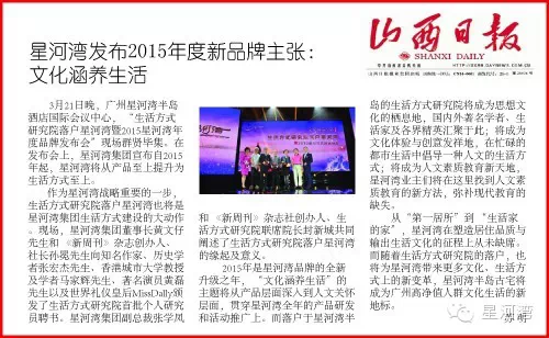 2015年是星河湾品牌的全新升级之年,「文化涵养生活」的主题将从产品层面深入到人文关怀层面,贯穿星河湾全年的产品研发和活动推广。《山西日报》对星河湾2015年的品牌主张的报道开篇直接点题。称生活方式研究院落户后,将成为星河湾思想文化的栖息地,通过文化体验、生活方式等多维角度阐述为居住者带来的生活改变。